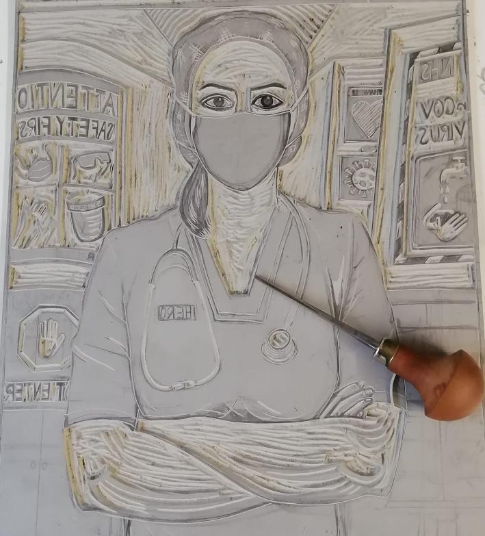 I produced my NHS nurse linocut print during early lockdown in May 2020. I discovered the organisation EveryDoctor UK, who were working alongside the Good Law Project, to expose the PPE scandal during the pandemic.